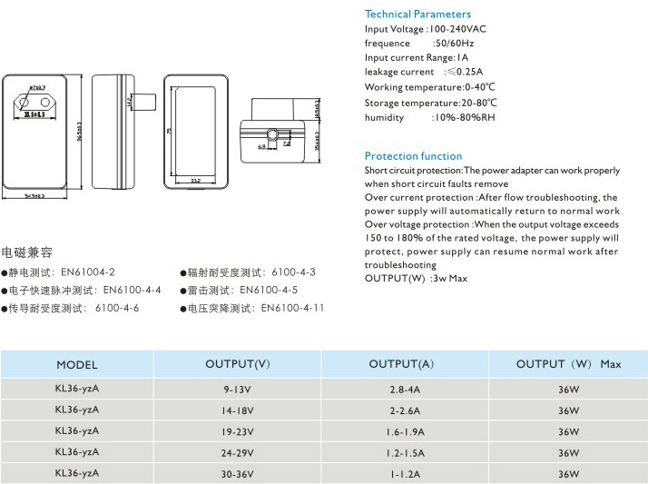 頻率:50/60Hz 輸入電流:1A 漏電電流:≤0.25A 工作溫度:0-40℃ 貯藏溫度:-20-80℃ 濕度:10%-80%RH 短路保護(hù): 電源適配器在短路解除時(shí)能正常工作恢復(fù) 過(guò)流保護(hù):過(guò)流故障排除后,電源將自動(dòng)恢復(fù)正常工作 過(guò)壓保護(hù):當(dāng)輸出電壓超過(guò)額定電壓的150-180%時(shí),電源將保護(hù),故障排除后電源能恢復(fù)正常工作" />